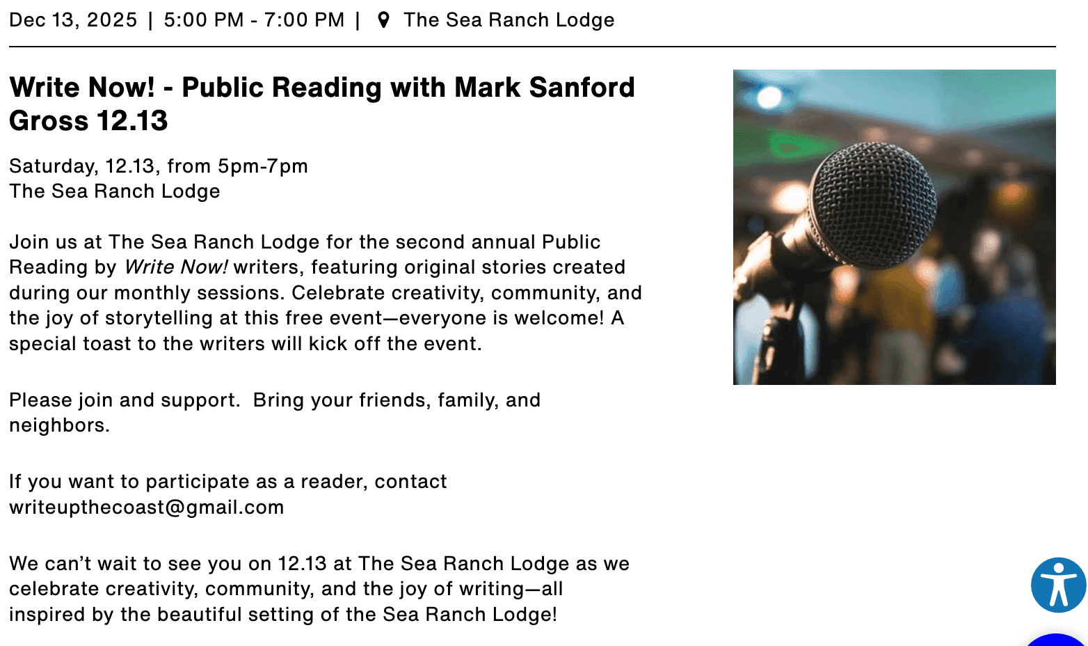 For updates and opportunities—also shared here—follow Write Up The Coast on Facebook and Instagram @writeupthecoast.